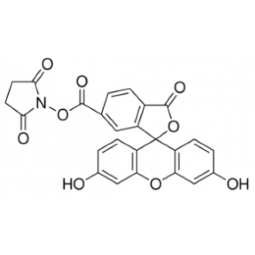 5(6)-carboxyfluorescein succinimidyl ester (Fluorescein-NHS) is an amine reactive green fluorescent dye with excitation/emission wavelength at 495 nm/515 nm.